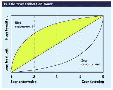 Klantentevredenheid raakt de kern van elke toekomstgerichte onderneming. Succesvolle ondernemingen blijken in de praktijk beter dan andere te begrijpen wat klanten beweegt. En ze kunnen ook beter tegemoet komen aan de veranderende wensen van hun klanten. Klantgerichtheid houdt een belofte in van klantentevredenheid. En een tevreden klant is eerder bereid klant te blijven en nog een keer terug te komen. Dus méér rendement en méér continuïteit. Het verband tussen tevredenheid en trouw is echter niet rechtevenredig. Die relatie wordt beïnvloed door de situatie in de branche of de markt, met name door de intensiteit van de concurrentie. In sommige branches kunnen klanten niet zomaar of gemakkelijk overstappen naar een andere aanbieder. Hoe minder concurrentie, hoe hoger de (gedwongen) loyaliteit en hoe minder belangrijk het wordt om klanten tevreden te stellen. Omgekeerd, hoe meer concurrentie in de markt, hoe lager de loyaliteit en hoe belangrijker het wordt om klanten volkomen tevreden te stellen. |